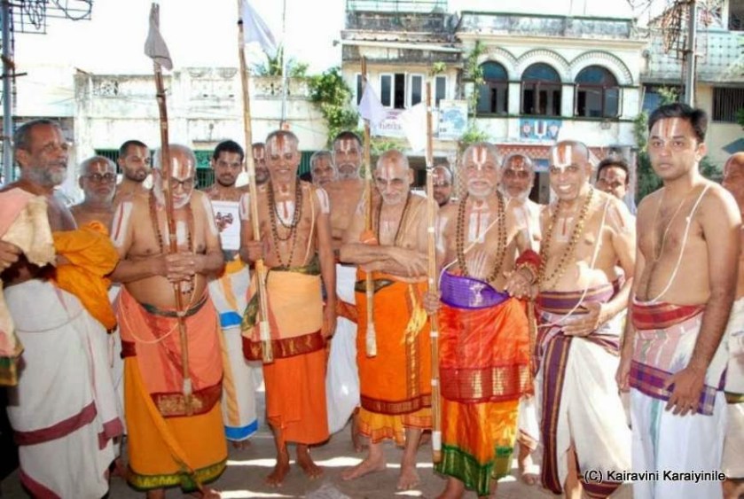 Vier Āchāryas unserer Linie: zweiter von links HH Kaliyan Vanamamalai Jeeyar Swami, der aktuelle Āchārya in der Linie von Manavala Māmunigal (siehe unsere Tradition), in der viele im koyil.org Team Schüler sind. In der Mitte dann HH Appan Parākala Embar Jeeyar Swami, der Āchārya von Mādhava. Zweiter von rechts ist Dr. M.A. Venkatakrishnan, ein bedeutender Experte und Redner zu den Schriften unserer Tradition.